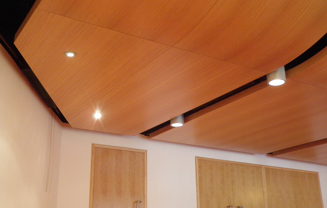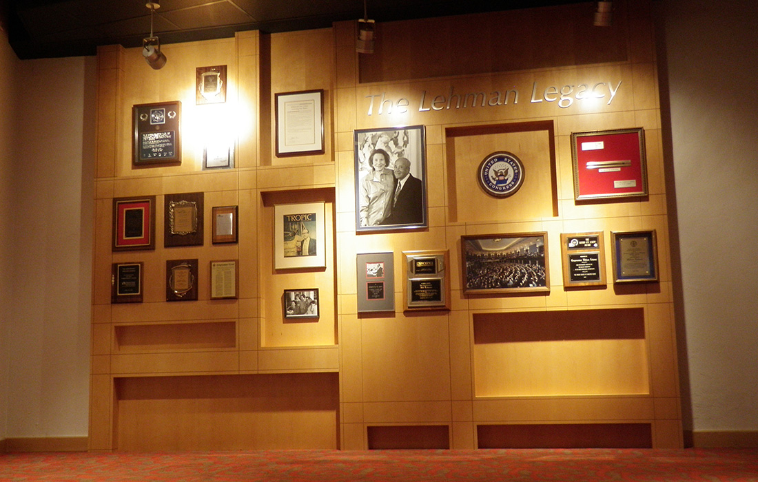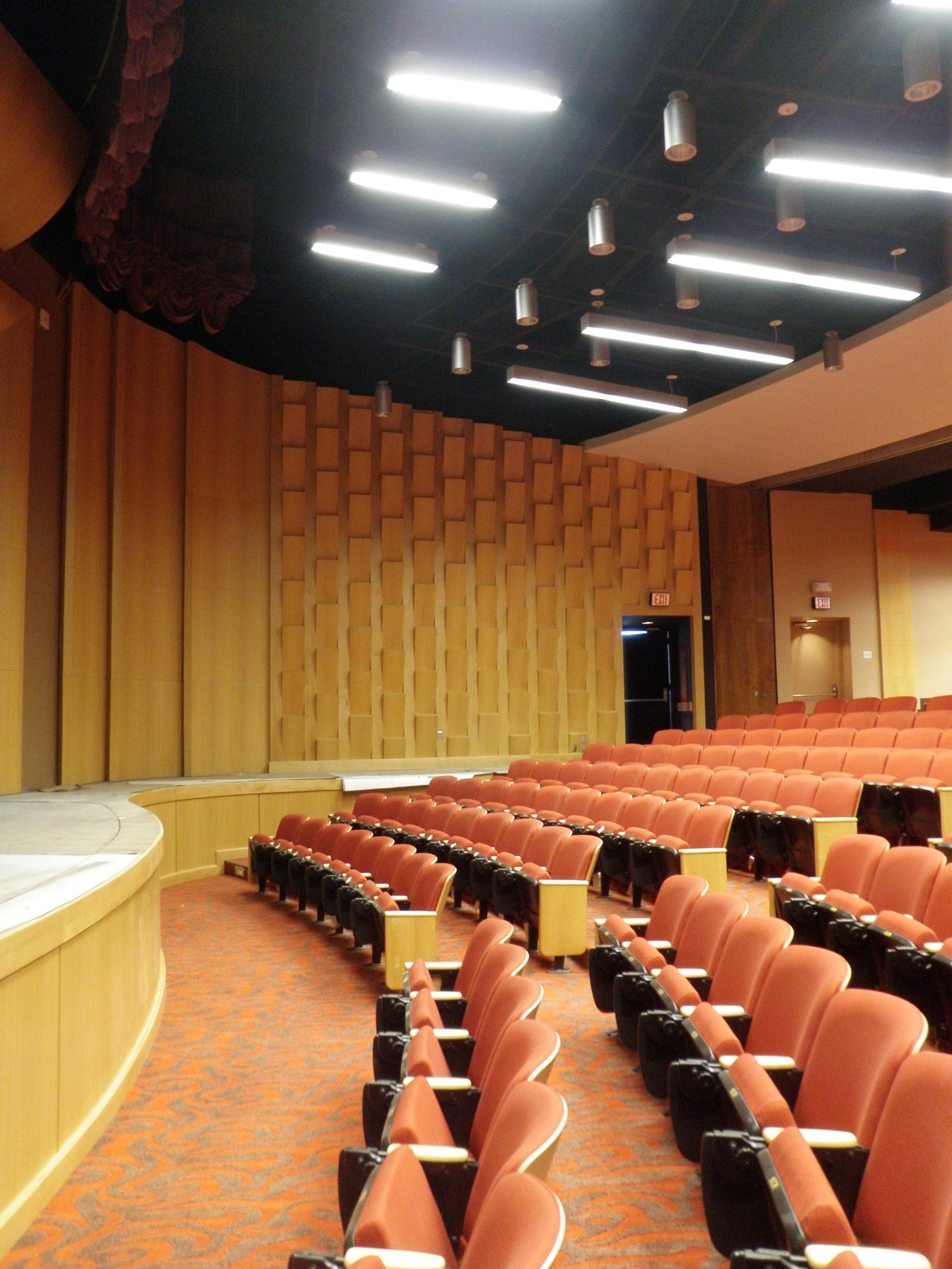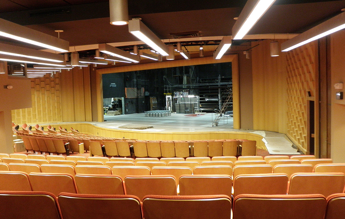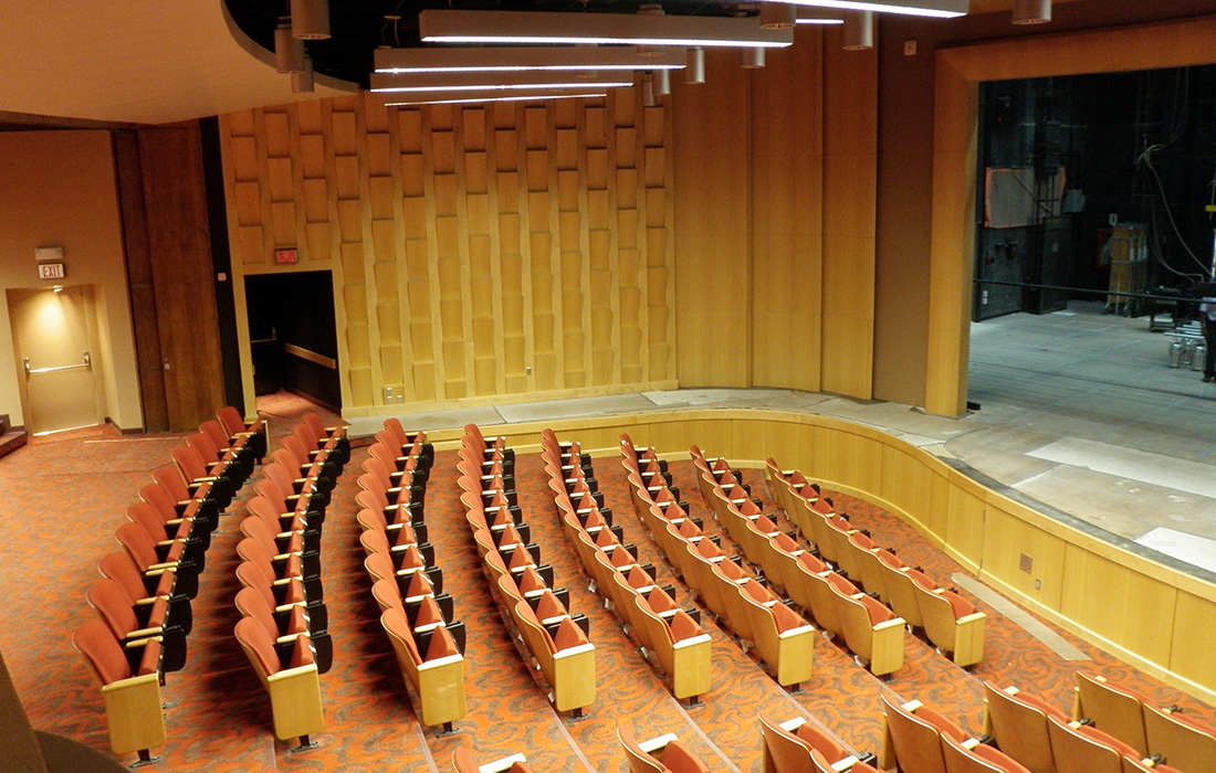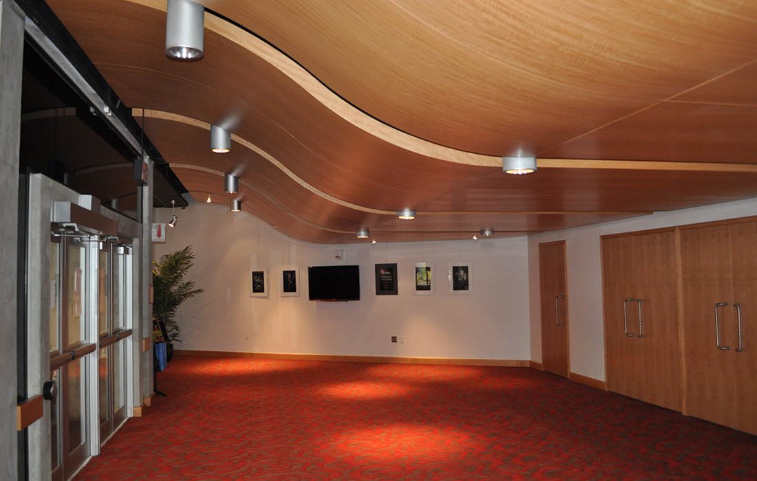 Custom millwork renovation that included engineering, production, and installation of lobby curved ceiling, memorial wall, seating area access solid wood doors, seating area curved walls, wood columns, acoustical walls, curved stage wall, and proscenium arch.